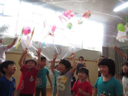 最後は大きなビニールにつくったクラゲを貼って、海の中にクラゲと一緒にいるような感覚で遊びました。