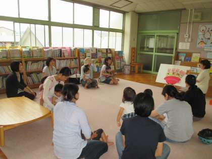 子どもたちはビニールプールに入ったり、「ぞうさんのぼうし」の歌に合わせてペープサートを見たりして遊びました。