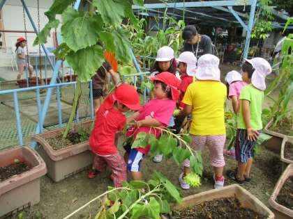 今日は園庭のプランターの夏野菜やひまわりを抜いて,コスモスなど秋の花を植えました。
