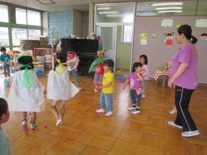 ことり組の子どもたちが,「へんしんにんじゃじゃん」の踊りを踊ってから,忍者になって遊ぶことが好きになりました。