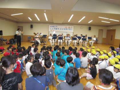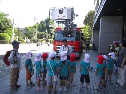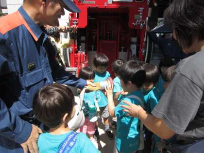 みんなで上京消防署に行って来ました。まずは、消防音楽隊の演奏を聞き、大きな音に少し驚いていましたが、知っている曲が流れるとみんなで手拍子をしたり、歌を口ずさんだりして楽しみました。次のお楽しみは、消防自動車の見学です。はしご車やポンプ車を見たり、消防車に付いているいろんな器具の説明も一生懸命聞いていました。また、ポンプ車の後ろにホースを積んだ小さな車をに出してもらい、実際に使うホースを見せてもらいました。すると、長いホースの中を不思議そうに覗き込んでいた子どもたちでした。