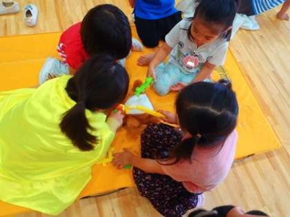 教師が「みんなのおかげで元気になったよ!ありがとう!」と伝えると,ある子どもが「まだ!先生転んで!」と言いました。どうやらまだお医者さんになって遊びたかったようです。教師が転ぶと,マットを病室のベットのようにして,教師の周りを子どもたちが取り囲んで手術が始まりました。お薬をくれたり,ジュースをくれたり,注射をしてくれたり,子どもたち一人一人が教師とのやり取りを楽しんでいました。その後,楽しくなってきたのか,持ってきた人形や友達の周りを囲んでお医者さんごっこを続けていました。