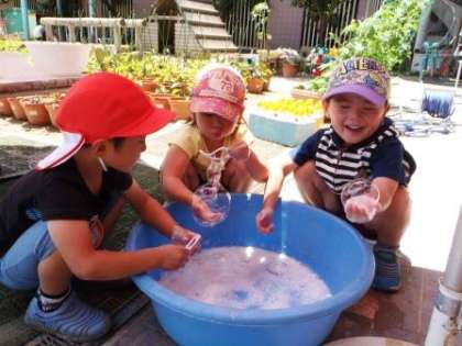 石鹸を使って,泡遊びを楽しんでいる4歳児のばら組。