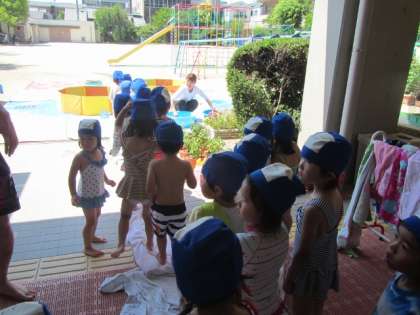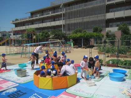 今日は保育室前のビニールプールで2クラス一緒に遊びました。