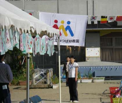 今年は15周年を記念しての運動会であったので,入場行進の先頭にみつば幼稚園の旗を持って入場しました。そして,開会式開会の前に旗を高く掲げました。