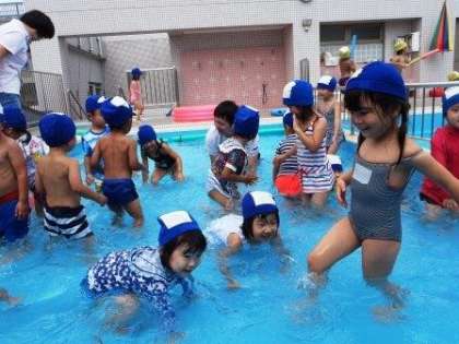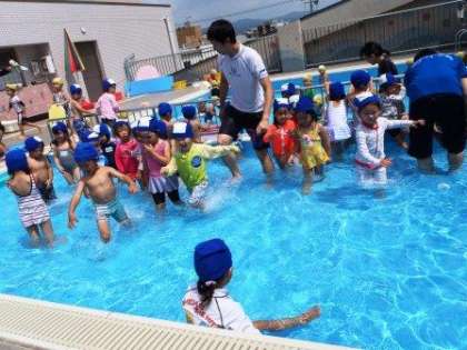 先週までも楽しんでいたじょうろや水鉄砲,ペットボトルのシャワーなど,自分の好きなことをのびのびと楽しむ姿がたくさん見られました。先生や友達と一緒に,ワニになったり,カエルになったりして,全身で水に浸かって遊ぶ楽しさは,広いプールならではです。あんまり楽しかったからか,降園前には,「もう眠たい。」とあくびをする子どもがたくさんいました。全身でいっぱい遊んだね。