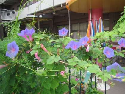 そのそばでは、西洋アサガオがきれいな青い花を咲かせています。