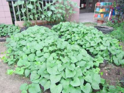 ゆり組が植えたサツマイモもツルが伸びて、畑が青々としています。