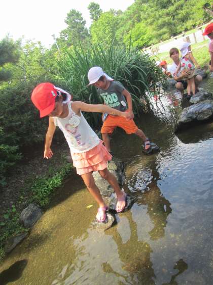 お泊り保育はじまりの式を終え,最初のお楽しみは御苑で川遊び!