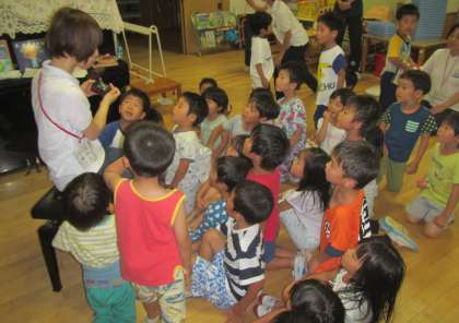 「金魚や魚たちは起きているのかな?」と水槽を見たり,いつもの部屋と違う雰囲気に恐る恐る歩く子どもたちでした。