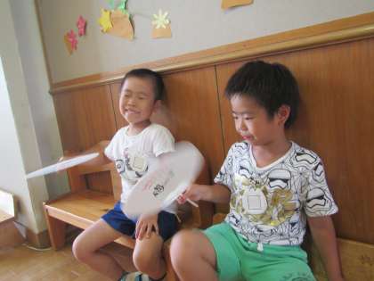 おとまり保育で楽しかったことをうちわにかき,世界に一つだけしかない素敵なうちわができました。