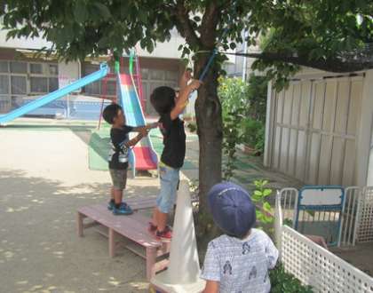 今日も朝からはりきって,園庭でのセミとりが始まりました。そのあとは、夏野菜にみずやり、小動物の世話、プール・・・と、夏の生活を十分に楽しんでいます。