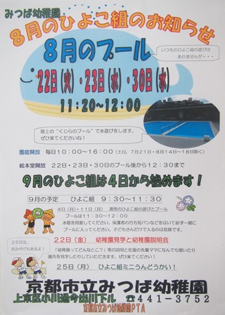 毎日暑いですね。8月もプールを開放します。みんなで誘い合って遊びに来てくださいね。