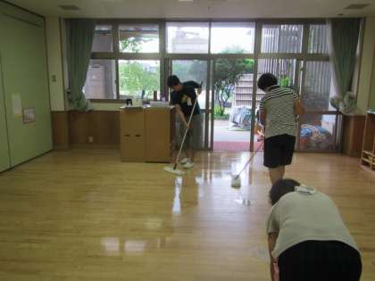 今日は遊戯室や保育室の物品を移動し、床にワックスなどを塗りました。