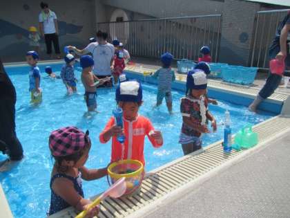 園庭で水遣りや虫取りなどを楽しんだ後、学年にわかれてプール遊びをしました。