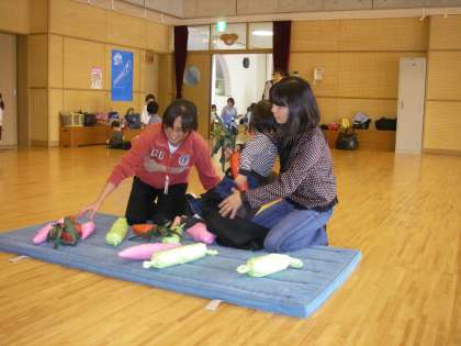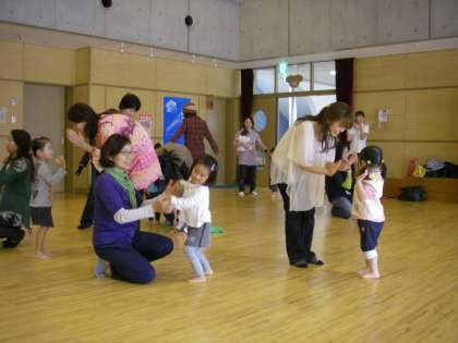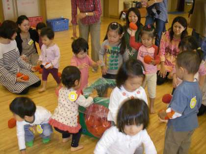 0歳児さん,1歳児さん,2歳児さんに分かれていただき,フープの車でお出かけをしたり,ちいさな山を登ったり,お弁当になったり,おんぶ競走をしたり,玉入れをいしたり・・・。