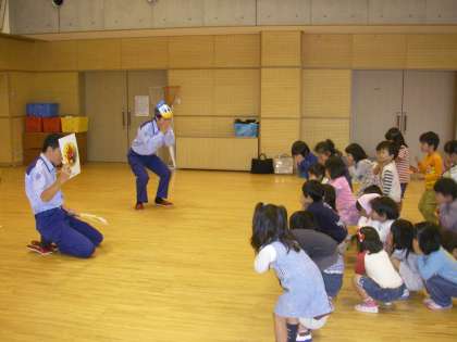 火事や地震・雷などのかかれたカードを防災課の方が見せられます。が決められています。地震の時には両手を頭に乗せてかがむ。火事の時には口を当てて「うっ」という。雷の時には体を丸めて低くなる。などポーズが決まっています。カードを見てすばやくポーズをとる・・・ということを繰り返しました。