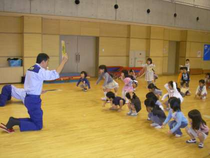 火事や地震の避難訓練を幼稚園でも行っていますが,この日はさらに「災害に対して自分の身は自分で守る力をつけよう」というねらいのもと,ばら組の子どもたちに楽しく実際に体を動かし声を出して遊びながら行う形で指導をしていただきました。