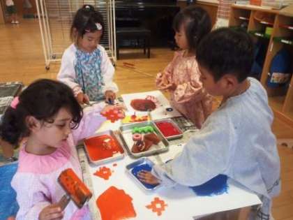 自分の紙の上でじっくりと,自分の好きな色をたくさん混ぜて遊んだり,偶然できたきれいな色にびっくりしたり,先生や友達の姿をみて,「自分もやってみたい!」と思ってそっと絵の具に触ってみたりと,一人一人が自分のペースで絵の具遊びを楽しんでいます。