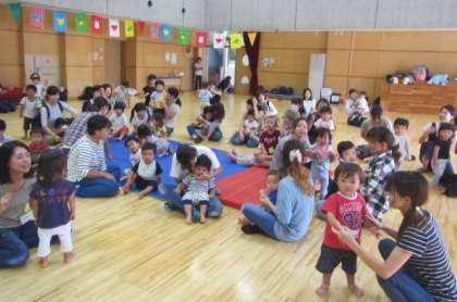 広い遊戯室をかけまわったり、たくさんの球をあつめたり、大きな布でかくれんぼしたり、親子でふれあい遊びをしたりして、楽しい運動会となりました。