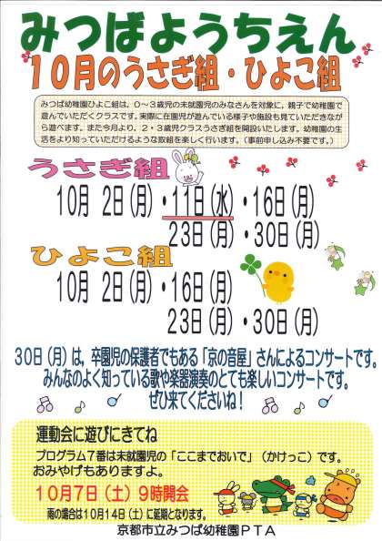 10月より,「幼稚園の生活ってどんなのかな?」と関心が高まっている2・3歳児さん親子対象に「うさぎ組」を開設します!今までひよこ組に登録していただいていた方は,特別な申し込みはいりません。10月は11日(水)がうさぎ組さんだけの親子の遊びの日です。徐々に幼稚園気分が味わえる内容にしていきたいと思っています。