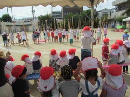 5歳児のゆり組がリレーや竹馬をしています。