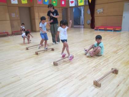4歳児はてんぐになって一本歯下駄であそんでいます。手をつないで歩いたり、段をのぼったりなどいろいろな歩き方を楽しんでいます。