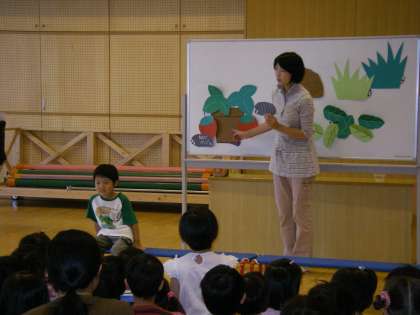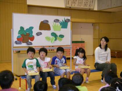 ♪まるまるまるむし だんごむし・・・♪の歌に合わせて葉っぱの下や石の下などに隠れているお友達のだんご虫を紹介してくれました。子どもたちは,「もう隠れていないかな・・」と真剣になってだんご虫さんを探していました。こどもたちが5人と先生が1人のみんなで6人だったのですが,4月に「早く僕の名前を呼んで!」ととてもアピールをしていた3歳児さんが,残念ながら今日はお休みでした。また今度一緒にお祝いしようね!
