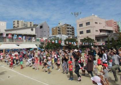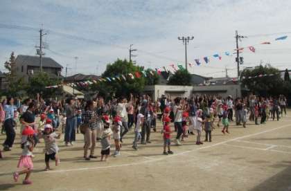 運動会の最後のプログラムは「みんなでおどろう」です。子どもたちとおうちの人と一緒におどります。
