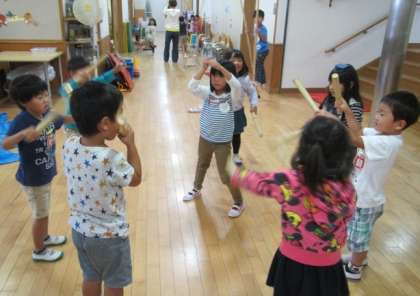 今日は、5歳児の子どもが4歳児に「ソイヤ!」を伝授していました。