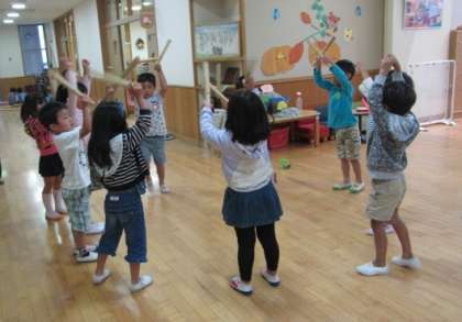 少し前から、4歳児の子どもたちが、5歳児の「ソイヤ!」の踊りをまねて遊んでいます。