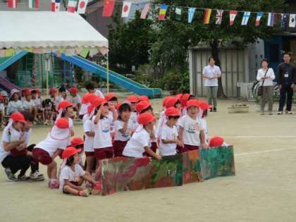 たくさんのお客様に驚いていましたが、声援を受けて、先生と一緒に、かけっこやおばけ探しの遊びをしました!