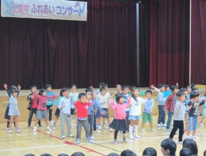 上京中ふれあいコンサートに,5歳児ゆり組の子どもたちが出演しました。京極幼稚園のみんなと合同で,歌を歌ったり,「エビカニクス」を踊ったりしました。「エビカニクス」では,上京中学校の吹奏楽部のお兄さん,お姉さんも一緒に踊ってもらい,さらに楽しく踊れたと思います。子どもたちは,たくさんの拍手をもらってうれしそうでした。