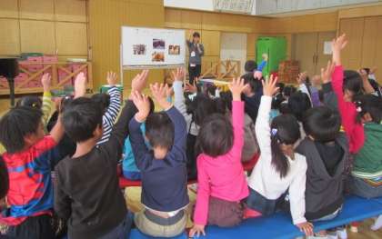 アオムシの写真が出たとき、子どもたちはすぐに答えがわかりました。アゲハ蝶の赤ちゃんです。これは、アオムシを育てた経験があるからだなあと思いました。正解した子どもたちは「やったー!」と大歓声。でも、ウサギやライオンの赤ちゃんを写真で見たときには様々な答えがでました。自分の予想と違う答えだった時には「おぉ〜」と感嘆の声が聞こえました。初めて知って驚いたり、考えたりするって大事ですね。