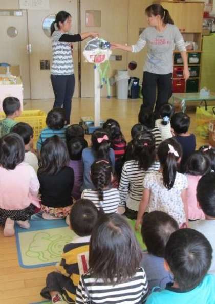 咳をすると・・・紐のついたばい菌のモデルがビューンと、後ろに座っていた子どものところまで伸びました。