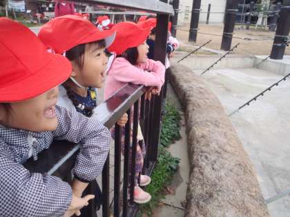 もも組とたんぽぽ組は,初めにゾウを見に行きました。みんなで「ゾウさーん」と呼んでみると,返事をしてくれました。ゾウの鳴き声を聞いてみんな驚いたり喜んだりしていました。