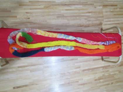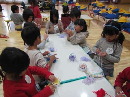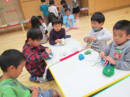 子どもたちは、ゆり組を中心になかよしタイムで毛糸の編み物を楽しんでいます。