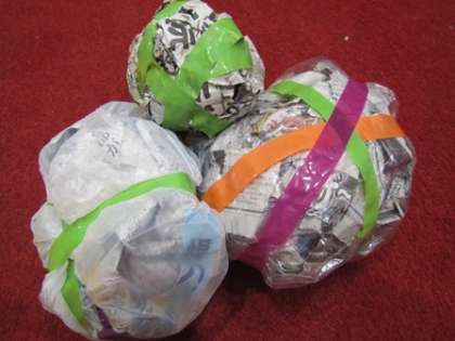 今日は,2・3歳児クラスのうさぎ組のみんなで,新聞紙で遊びました。広げた新聞紙に乗ってお母さんにソリのように引っ張ってもらったり,綱引きのようにひっぱりあっこをしたり,パンチやキックで破ったり・・・いろいろなことをして楽しみました。中には新聞紙で装備をつけて,“ももたろう”に変身したお友達もいましたね!細かくなった新聞紙を投げあげて,いっぱい体に浴びた後,袋に新聞紙をつめこんでボールをつくって,またまたボール遊びを楽しみました。とても楽しくステキな笑顔で遊ぶみんなに大感激しました。また,おもしろいことをして遊ぼうね!12月のうさぎ組は,21日(木)楽しいパーティをします。ぜひ遊びに来てくださいね!(写真は新聞紙ボールです。今日のおみやげになりました。)