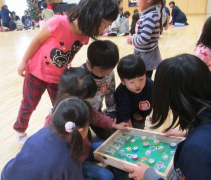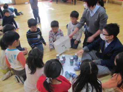 幼稚園の子どもたちは、初めは緊張気味でしたが、魅力的なおもちゃと中学生の優しいかかわりで、徐々に表情もほぐれ、一緒に話をしたり笑いあったりして、とても楽しい時間を過ごすことができました。