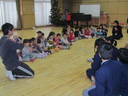 幼稚園の子どもたちは各学年ごとに中学生と一緒にジャンケン列車をしたり、手遊びをしたりしました。