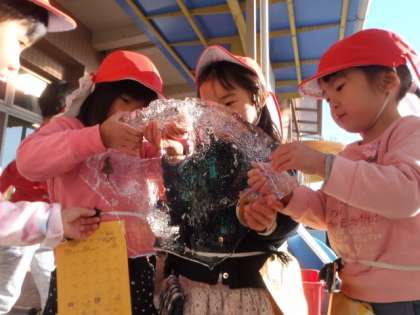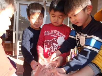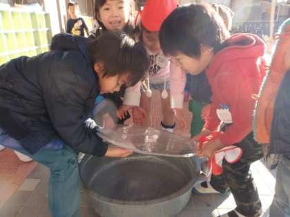 みつば幼稚園の園庭ではタライに氷ができました。