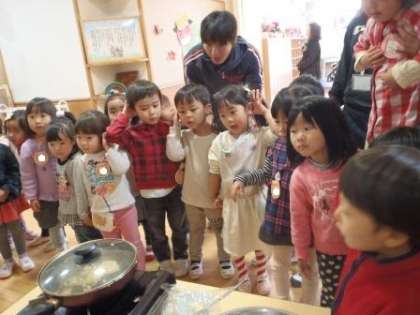 ポップコーンがフライパンの上ではじけて膨らむところを間近で見せてもらった子どもたち。「楽しみになってきた!」とわくわくしたり,音が聞こえるかな?と耳をすませたりしていました。大きくなったポップコーンに,「え〜?なんでや〜!?」と驚いている子どももいました。