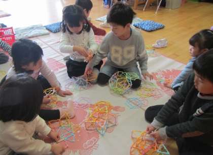 5歳児が、四角や三角の枠を組み合わせて様々な形をつくって遊んでいます。