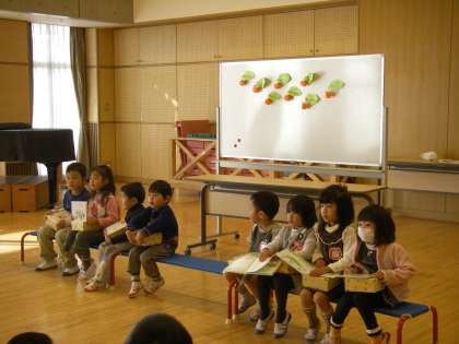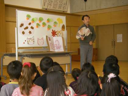 子どもたちは一生懸命お話を聞いていました。そして最後は,子どもたちも葉っぱやドングリとジャンケンをして遊びました。