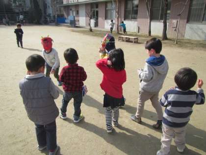 でも、3歳児の鬼は豆があたっても動じません。(5歳児のAちゃんは3歳児の鬼に向かって、とても優しく、そっと豆を投げていました。)