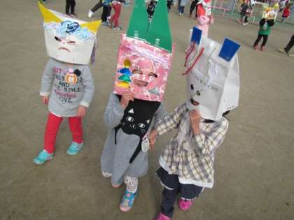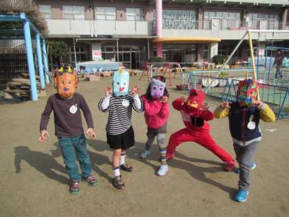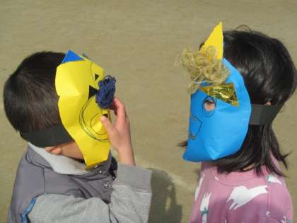 お面を付けて鬼になりきったり、お面を付けて互いの顔を見合わせたり、手をつないで歩いたり。