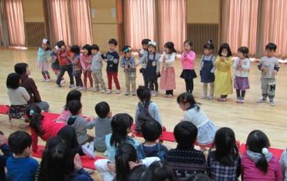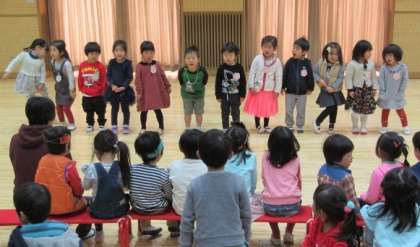 4月に入園した3歳児の子どもたちが一列に並んで、ちょっと恥ずかしそうにしながらも大好きな歌を歌っている姿はとてもほほえましいものです。4歳児・5歳児の子どもたちもお兄さん、お姉さん目線でしょうか、ニコニコと歌をきいていました。