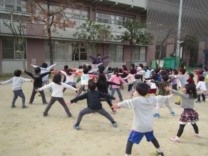 みんなでコーチの真似をして体を動かしてウォーミングアップ!