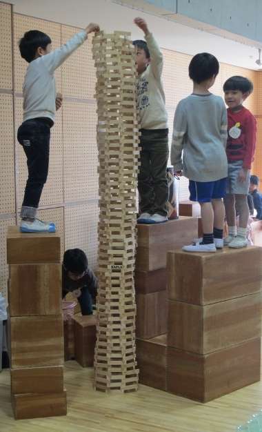 なんと、カプラ(板状の積木)でつくっていた円筒(子どもたちは「えんとつ」と呼んでいました。)がとっても高くなっているのです!