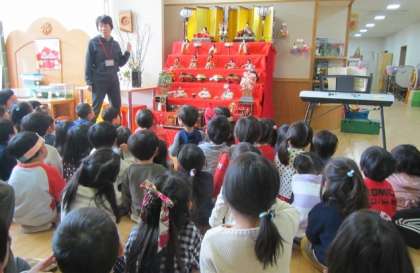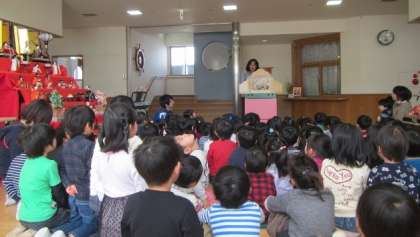 「うれしいひなまつり」の歌を歌ったり、ひな人形の話を園長先生から聞いたりしました。雛あられの紙芝居も見ましたよ。